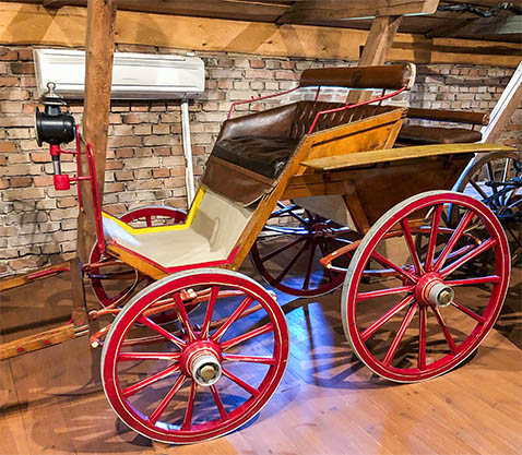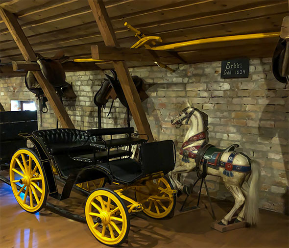 Opastettu kierros jatkui yläkertaan, jossa oli Wiurilan tilalla aikaisemmin käytössä olleita hevosvaunuja.